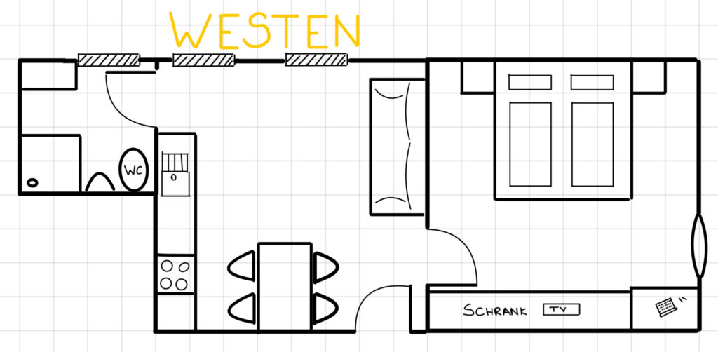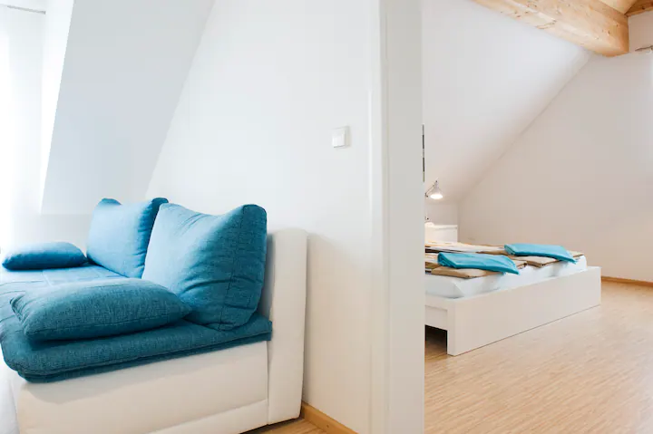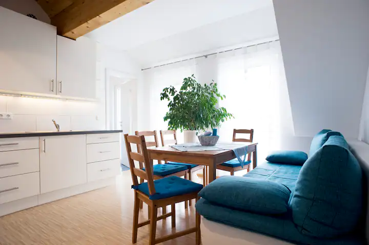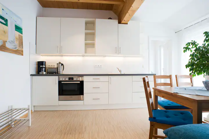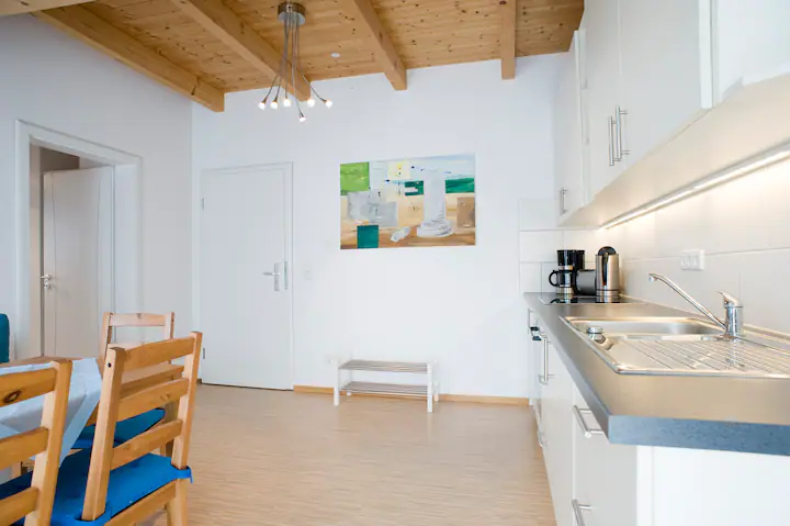 Die Wohnküche ist das Herzstück der Wohnung und bietet alles, was Sie für einen angenehmen Aufenthalt benötigen. Sie ist mit modernen Annehmlichkeiten wie einem Herd, Backofen, einer Kaffeemaschine, einem Toaster und einem Wasserkocher ausgestattet. Der großzügige Esstisch mit vier bequemen Stühlen lädt zu gemeinsamen Mahlzeiten und geselligen Stunden ein. Die gemütliche Schlafcouch, die sich in ein Doppelbett verwandeln lässt, bietet zusätzlichen Komfort und Flexibilität.