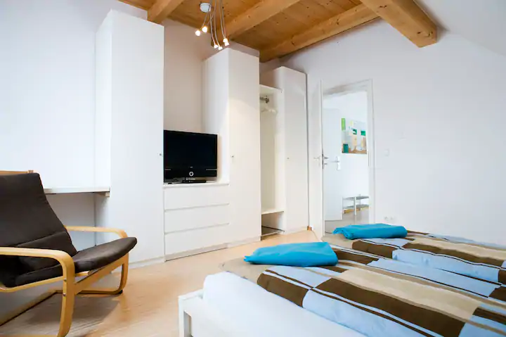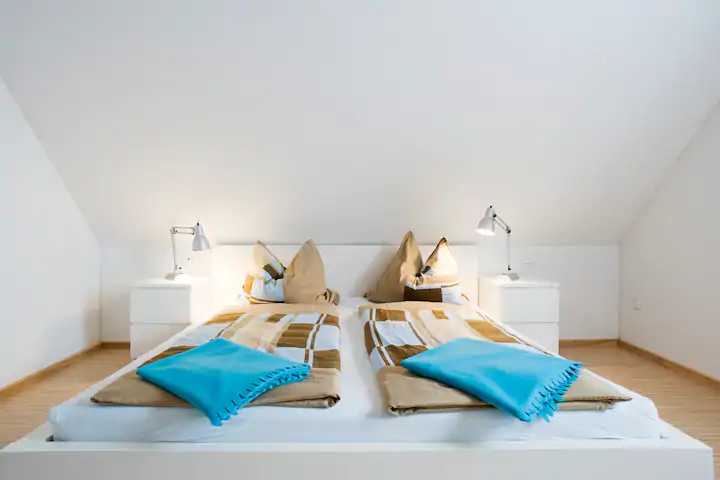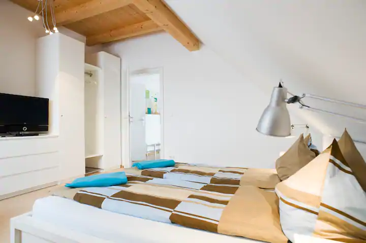 Das Schlafzimmer ist eine Oase der Ruhe mit einem großzügigen Doppelbett (1,80m x 2,00m), das Versprechen auf erholsame Nächte gibt. Ausreichend Stauraum finden Sie in den geräumigen Schränken, und der praktische Schreibtisch eignet sich ideal für Gäste, die auch im Urlaub nicht auf ihre digitale Routine verzichten möchten. Ein Fernseher im Schlafzimmer sorgt für entspannte Abendunterhaltung.